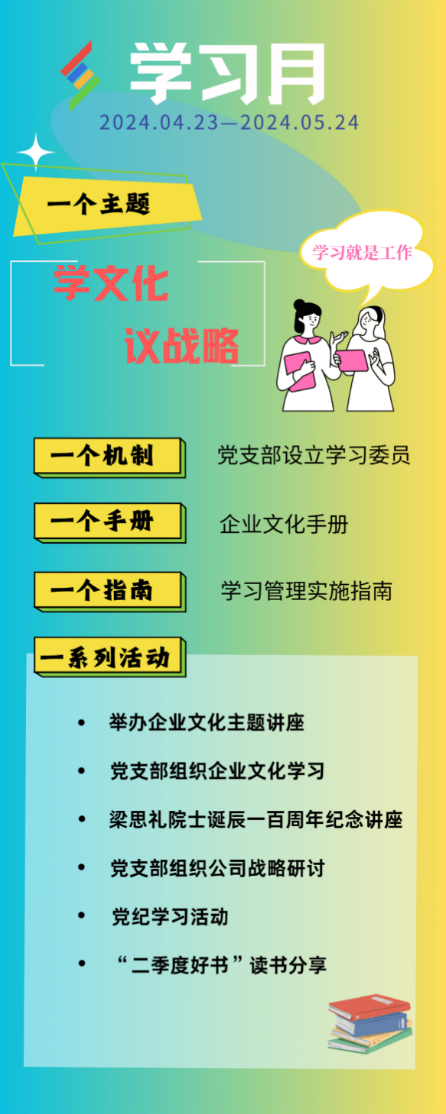 423日,神軟公司啟動首屆學習月活動,以學文化 議戰略為主題開展系列活動,鼓勵干部員工多學習、多參與公司戰略制定,樹立學習就是工作的理念,通過學習解放思想、轉變觀念、提高認識,進一步提高建設數字航天的能力