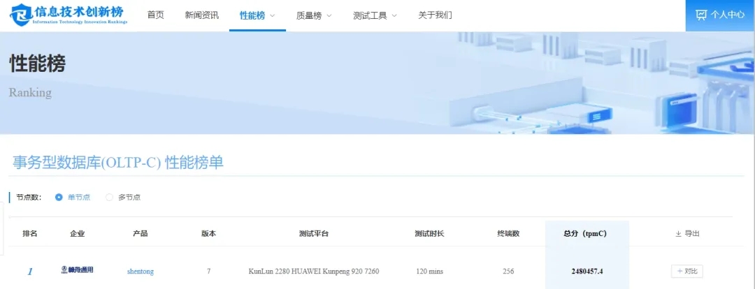近日,由工業和信息化部電子第五研究所發起的“信息技術創新榜”,發布了事務型數據庫(OLTP-C)性能榜單,神軟子公司神通公司的神通數據庫產品在評測中脫穎而出,榮獲第一名。